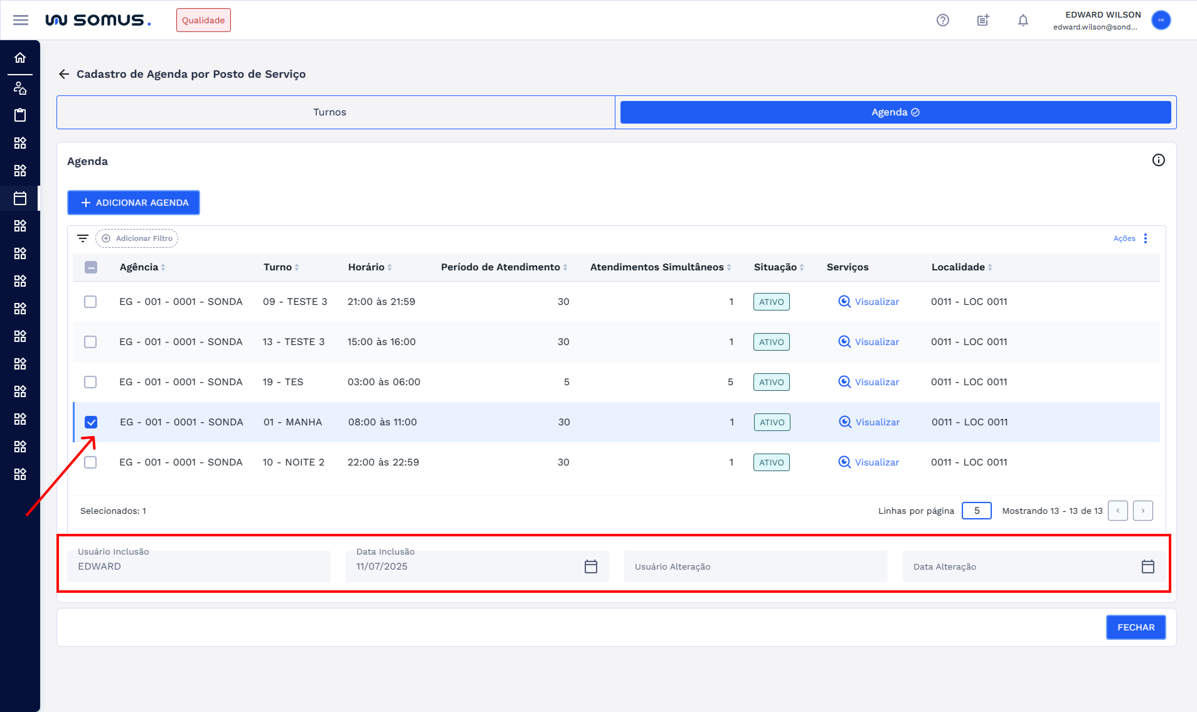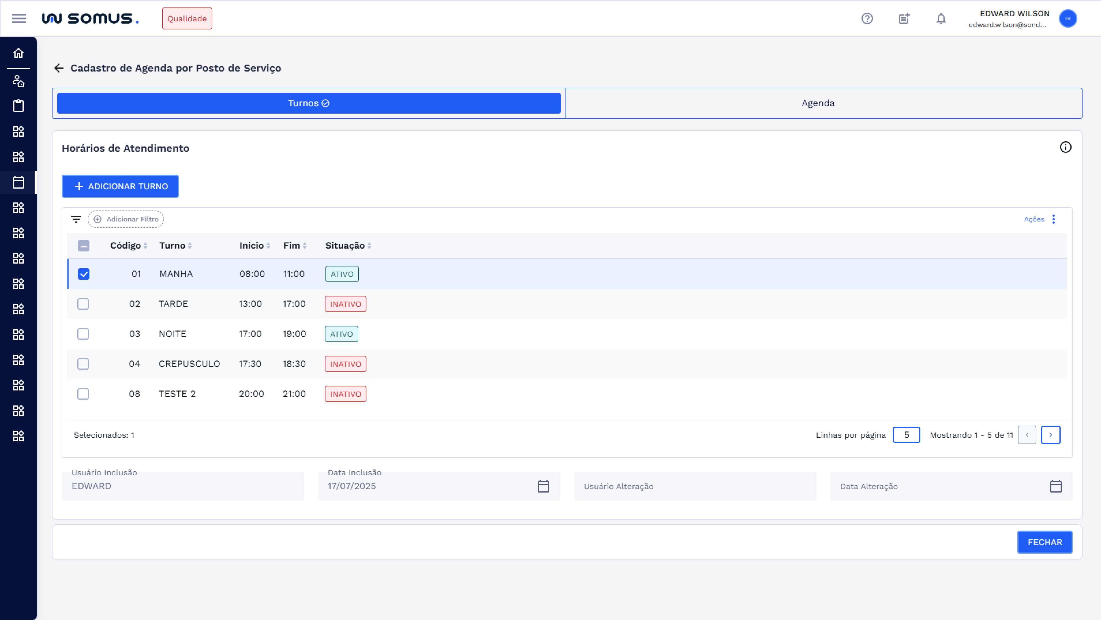 Ao selecionar um registro na lista, os dados de auditoria referentes ao turno (usuário e data de inclusão, usuário e data de alteração) são exibidos na seção inferior da tela.