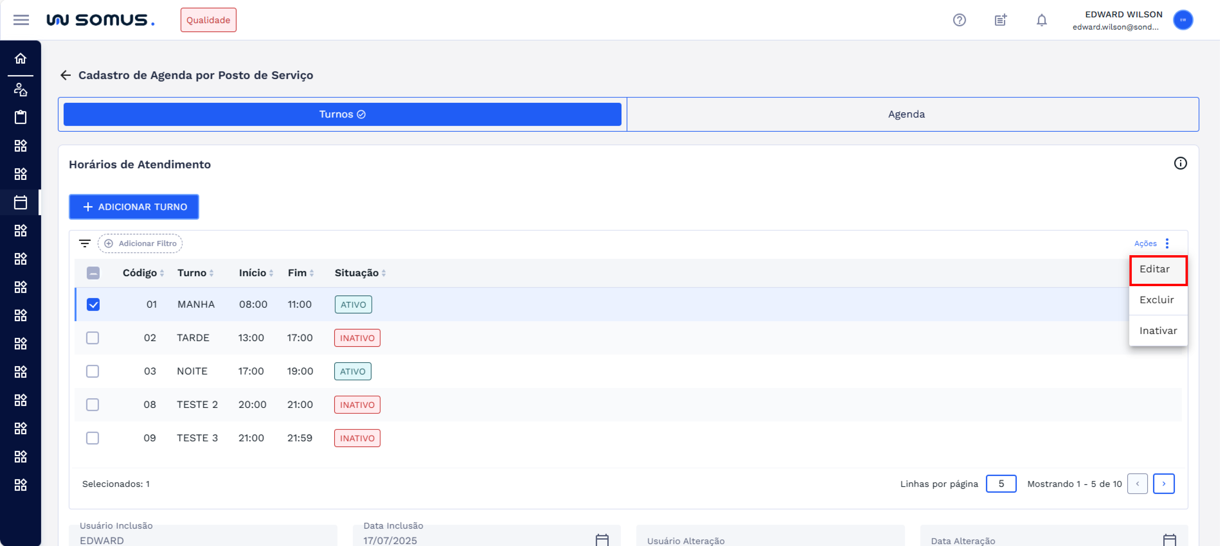 Para editar um turno cadastrado, primeiro localize o registro desejado na lista. Em seguida, selecione o turno e clique no botão “Ações”.