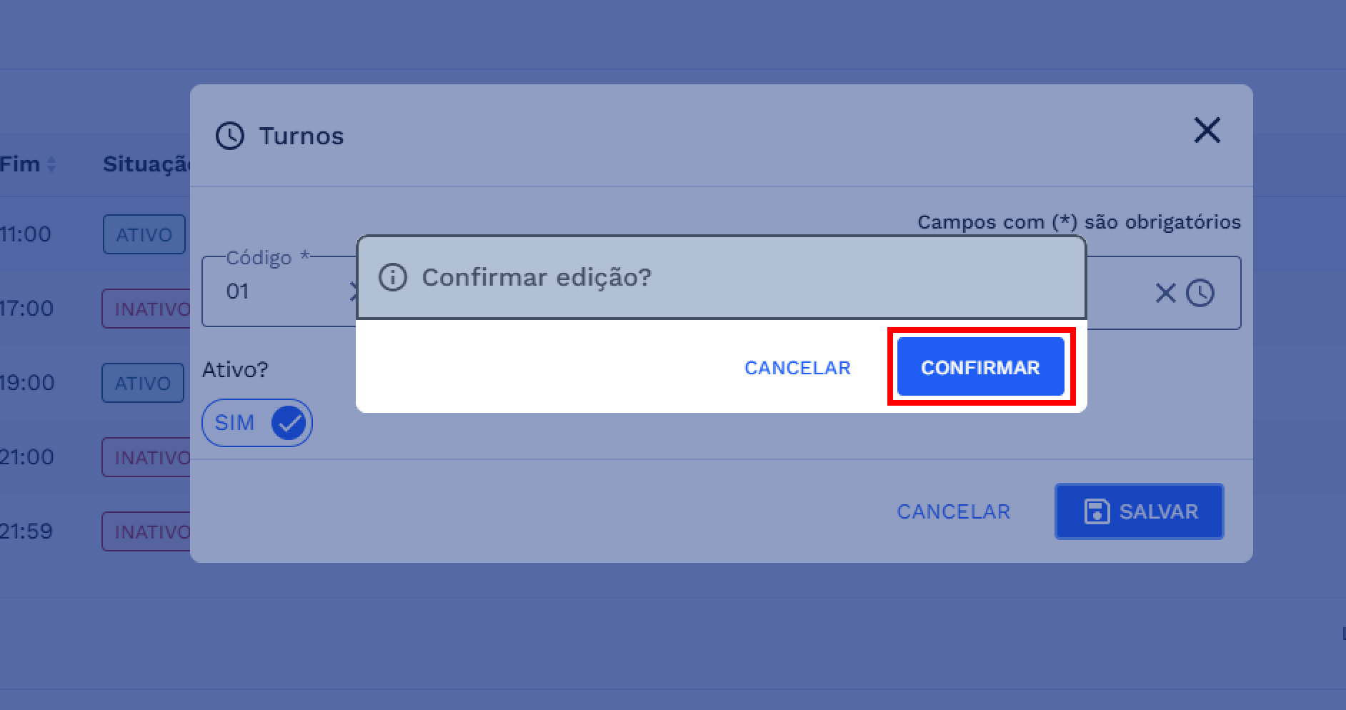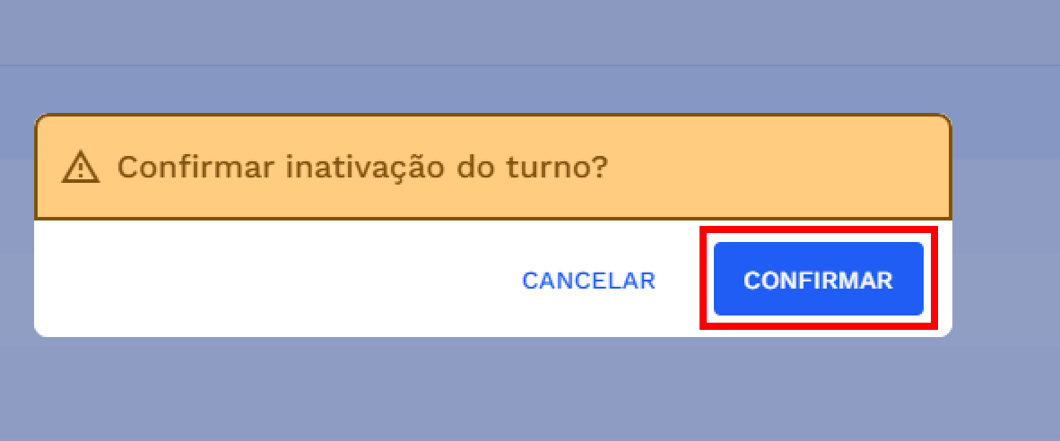 Ao clicar em “Inativar” no menu “Ações”, o sistema apresentará uma caixa de diálogo solicitando a confirmação da inativação do turno. Para confirmar e concluir a inativação, clique em “CONFIRMAR”; caso queira desistir da operação, selecione “CANCELAR”. Confira o exemplo na imagem abaixo: