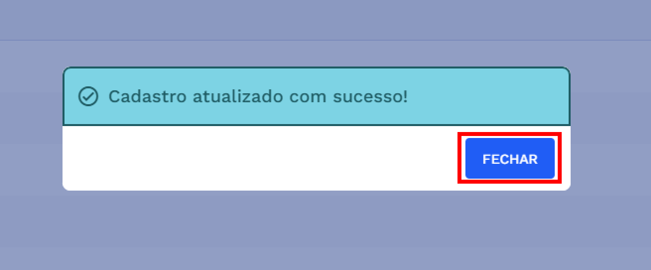 O sistema realizará todas as validações necessárias antes de confirmar a atualização. Caso não exista nenhum impedimento, será exibida uma caixa de diálogo indicando que o cadastro foi atualizado com sucesso.