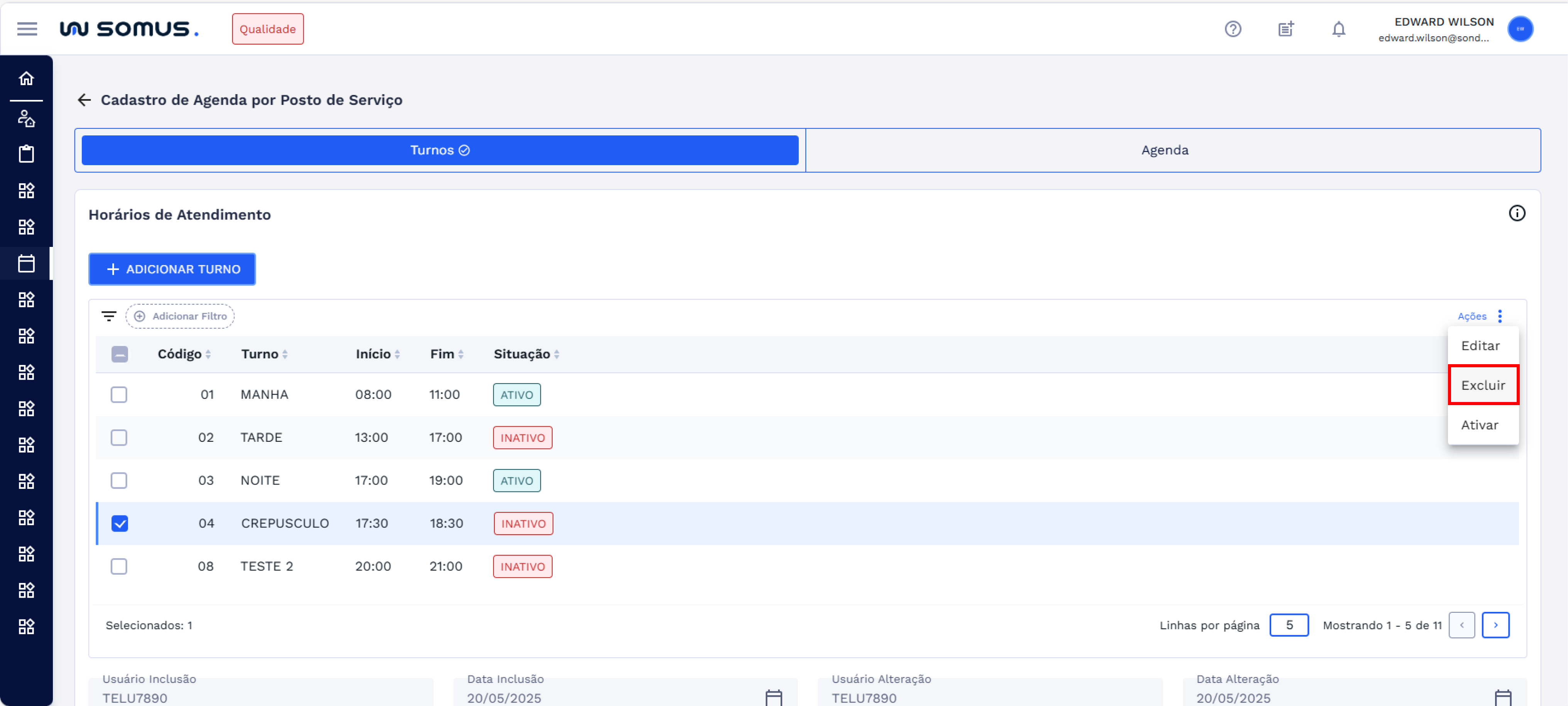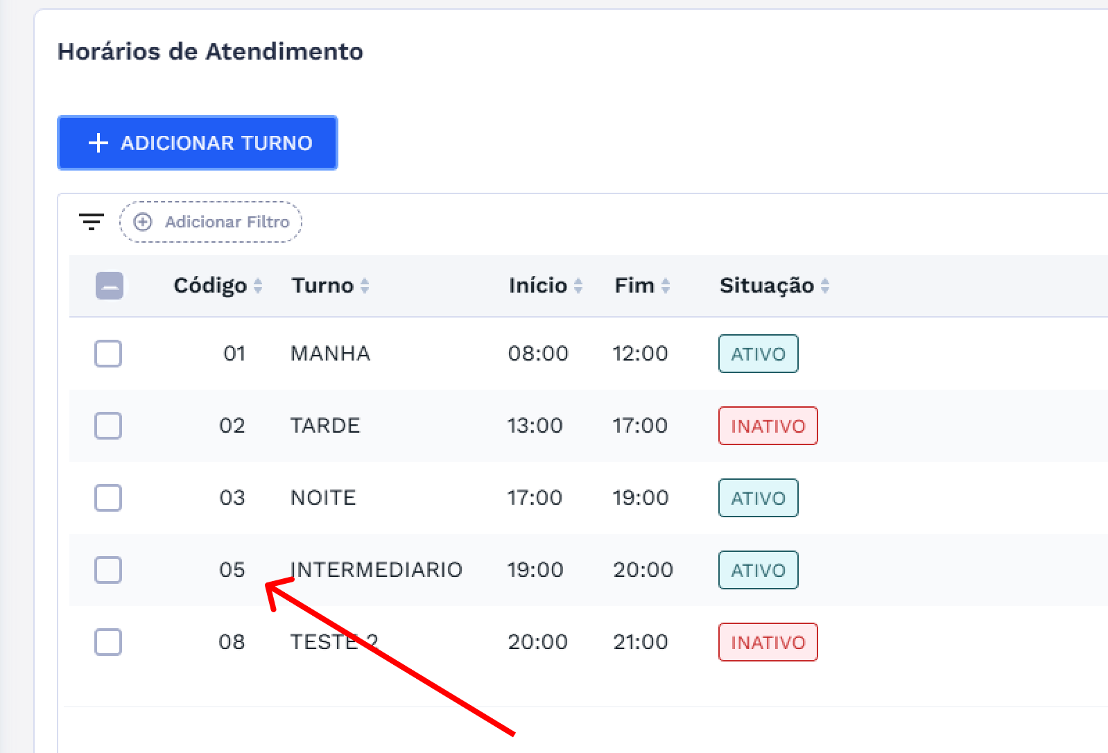 Para realizar a exclusão, acesse a aba de turnos com os horários de atendimento e selecione o registro desejado.