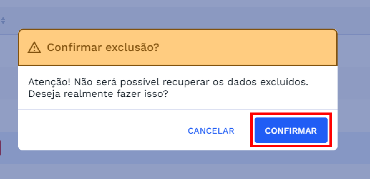Em seguida, o sistema exibirá uma caixa de diálogo solicitando a confirmação da exclusão. Para prosseguir, clique em “CONFIRMAR”; caso não queira continuar, clique em “CANCELAR”, encerrando a operação sem alterações.