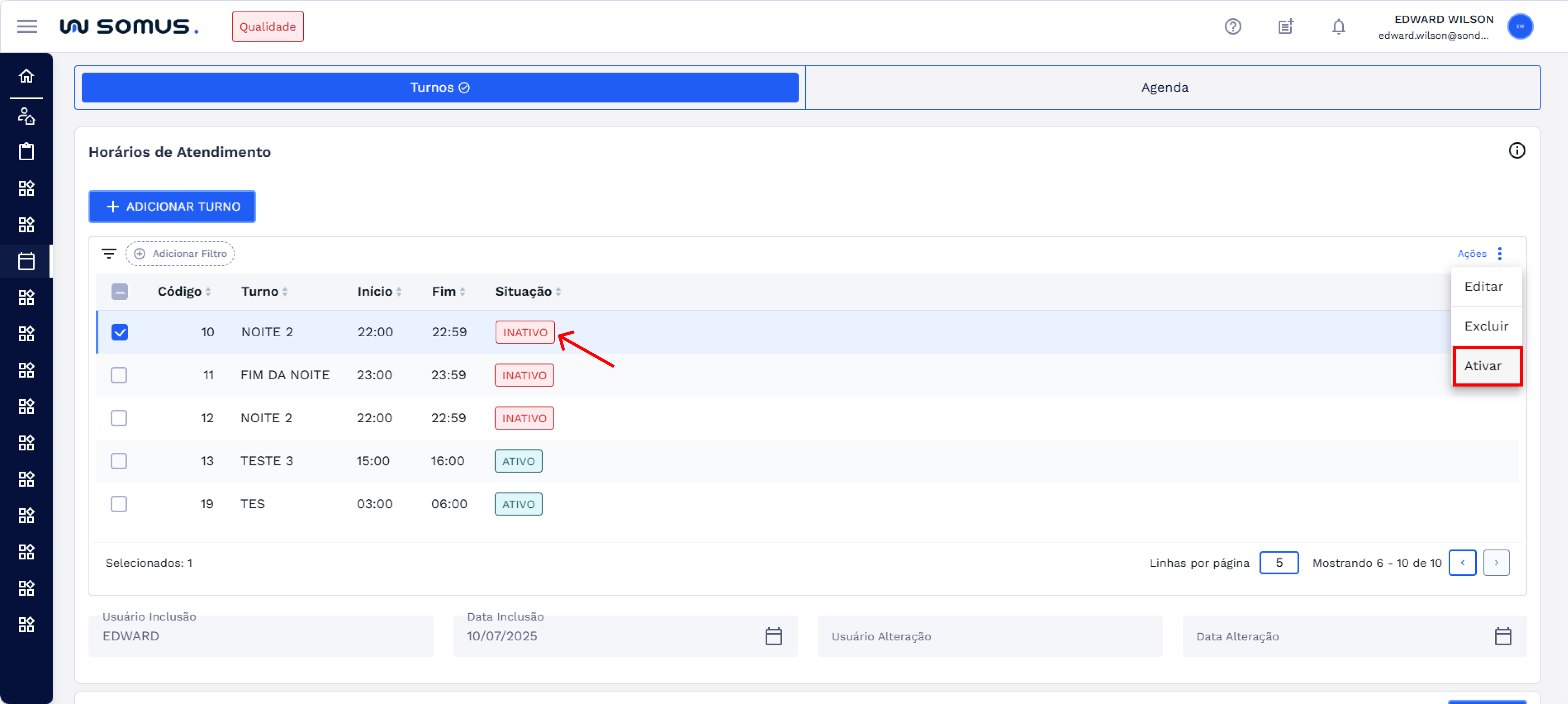 Para realizar a ativação, acesse a aba de turnos, com os horários de atendimento, e selecione o registro desejado que esteja com a situação inativo. Em seguida, clique no botão “Ações”, que disponibilizará a opção “Ativar”.