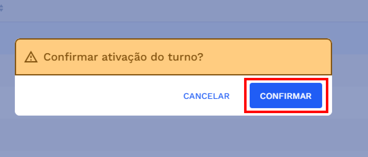 Ao clicar em “Ativar” no menu “Ações”, o sistema exibirá uma caixa de diálogo solicitando a confirmação da ativação do turno. Para confirmar e prosseguir com a ativação, clique em “CONFIRMAR”; caso queira cancelar a operação, clique em “CANCELAR”. Veja o exemplo ilustrado na imagem abaixo: