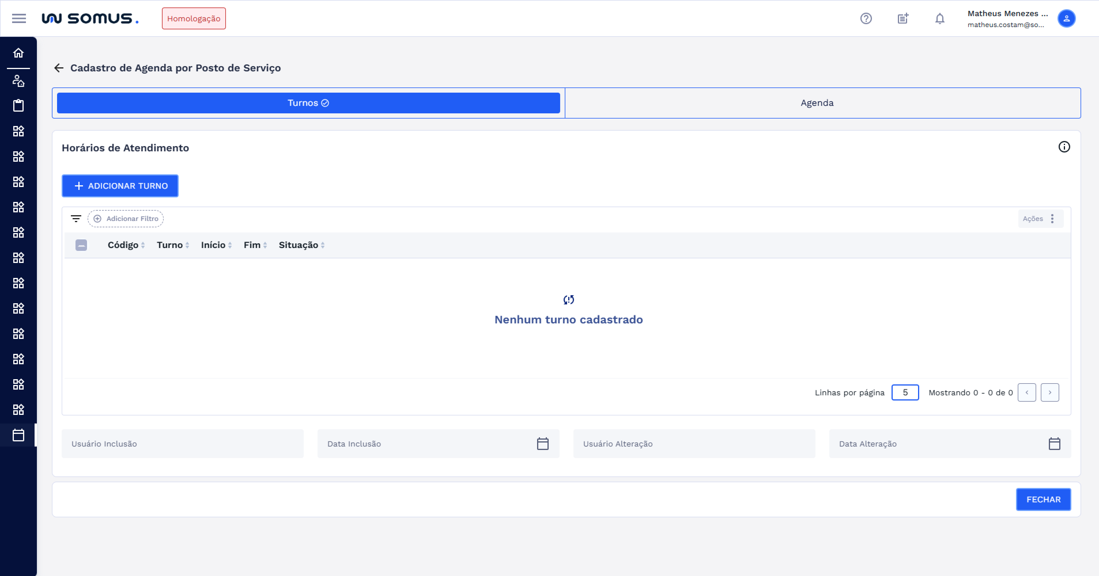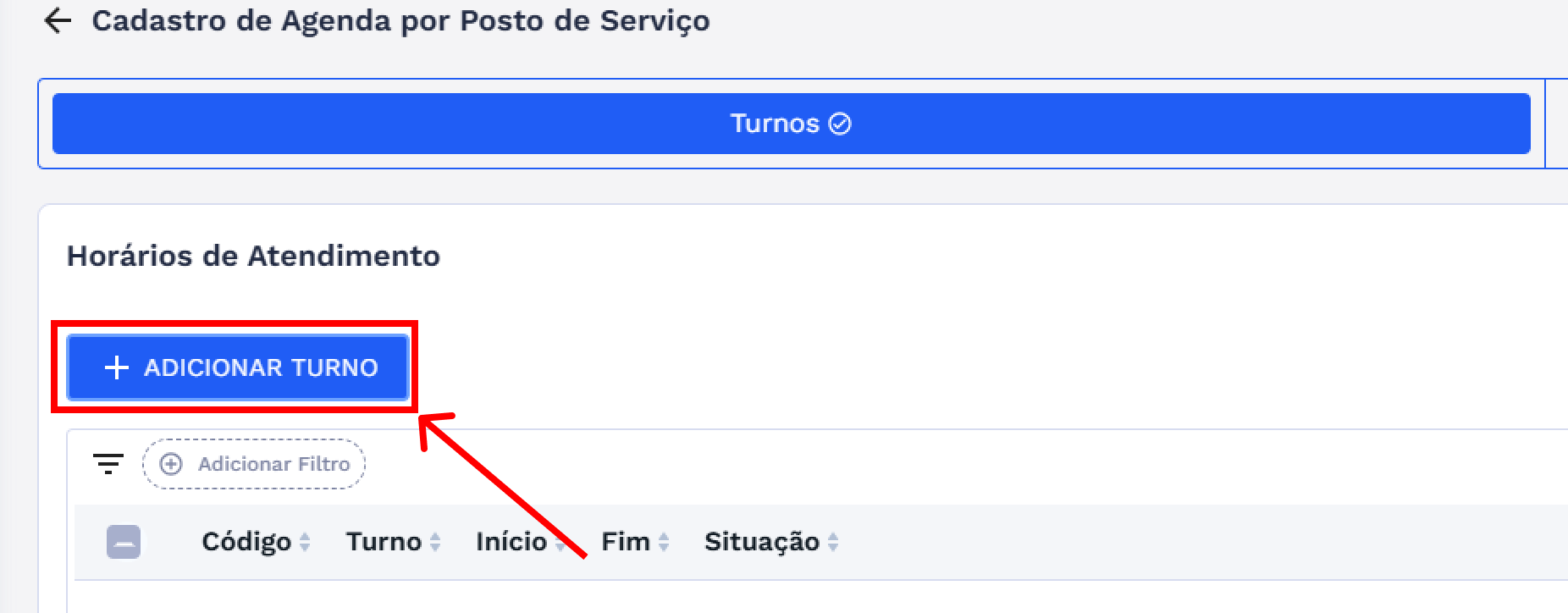 Nesse cenário, o usuário pode prosseguir diretamente para o cadastro de novos turnos utilizando o botão “Adicionar Turno”.