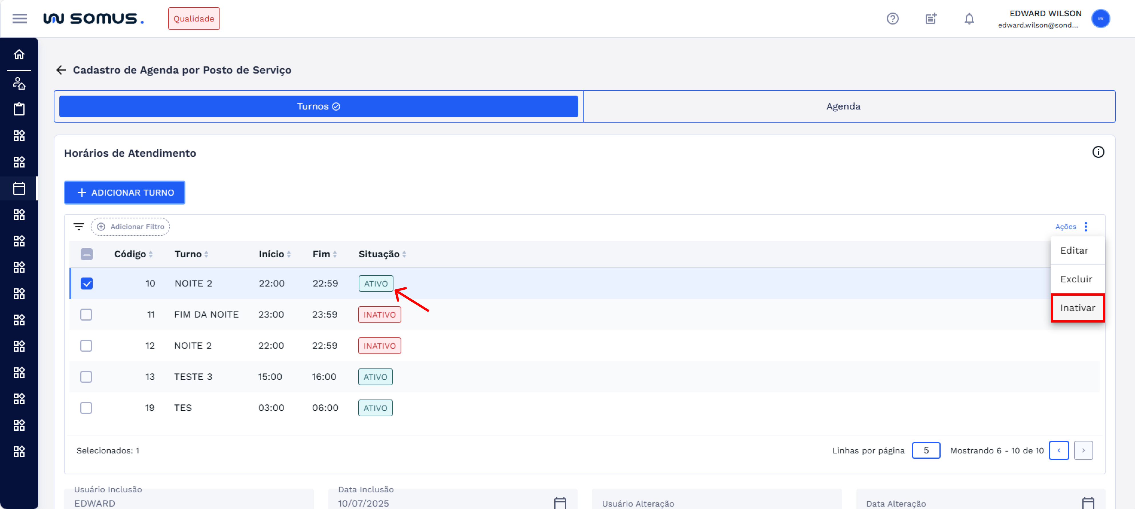 Para realizar a inativação, acesse a aba de turnos e selecione o registro desejado que esteja com a situação ativo. Em seguida, clique no botão “Ações”, que disponibilizará a opção “Inativar”.