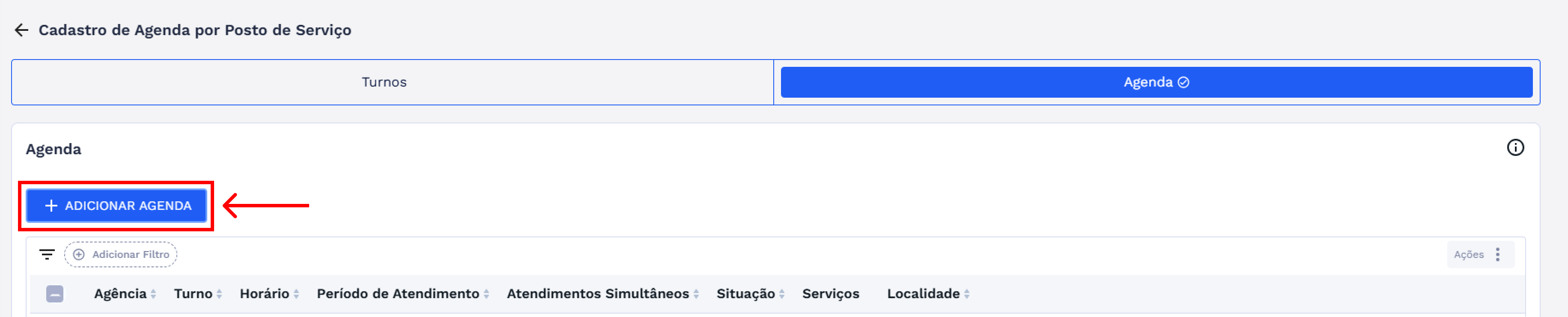 Na aba de agenda, clique no botão “+ ADICIONAR AGENDA”, localizado no canto esquerdo superior da lista de agendas.
