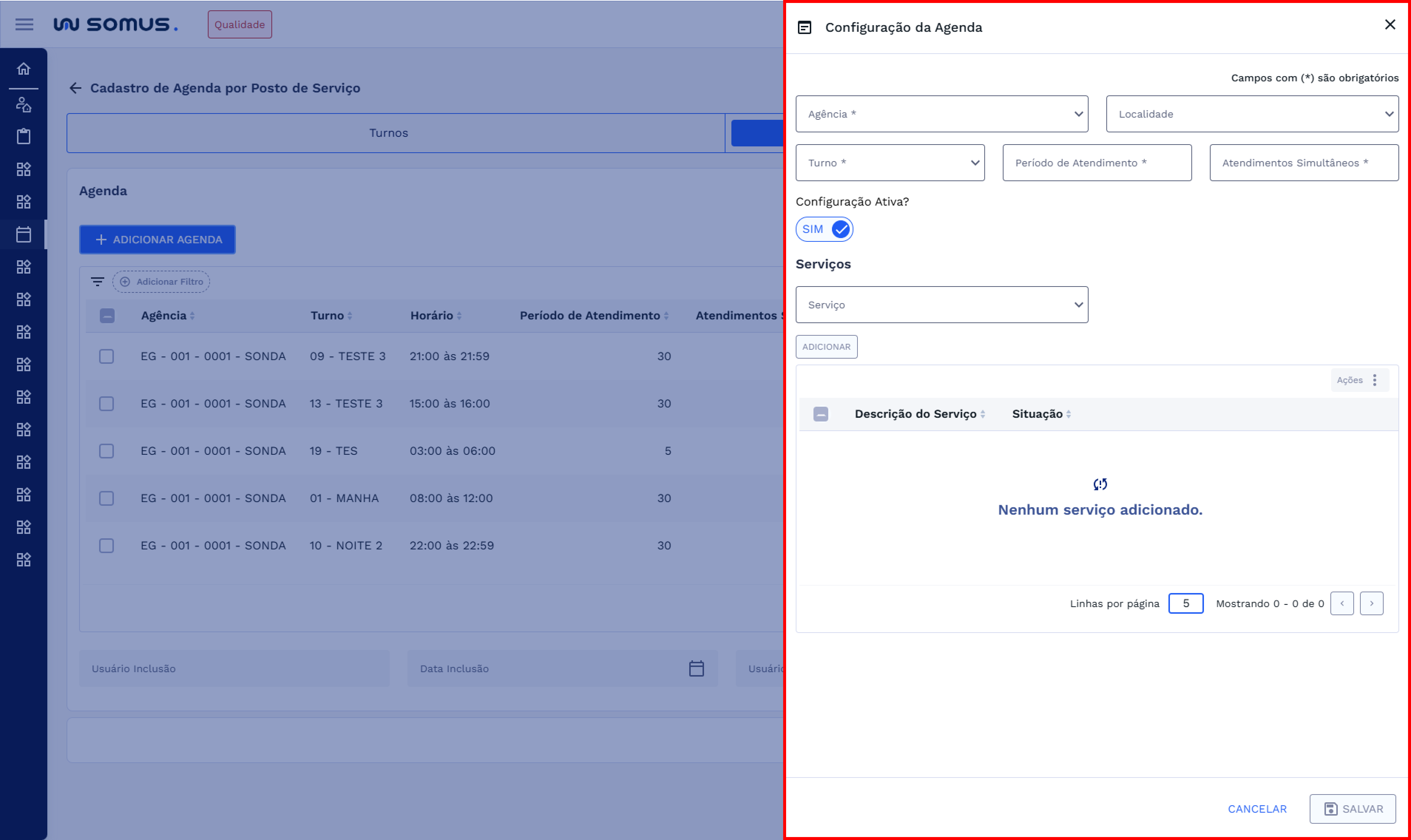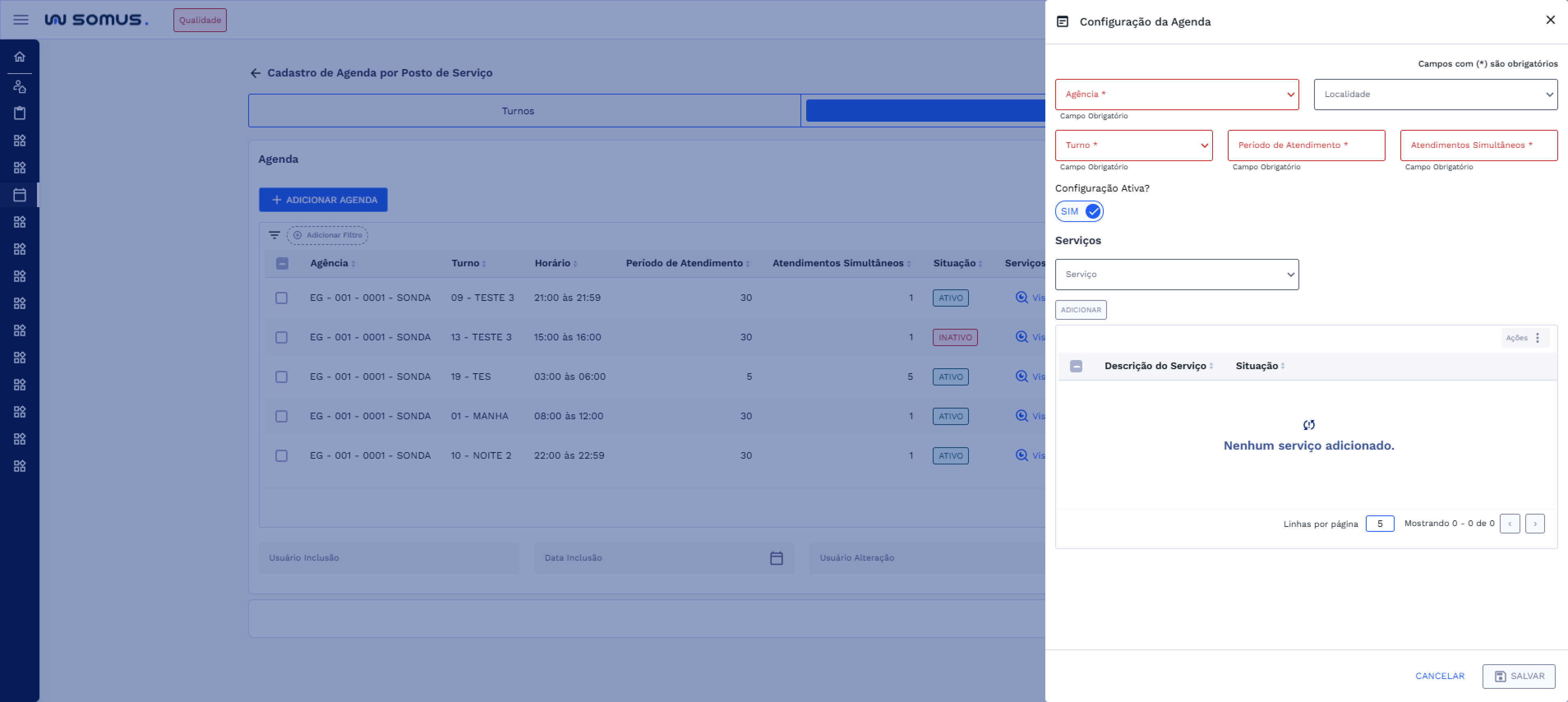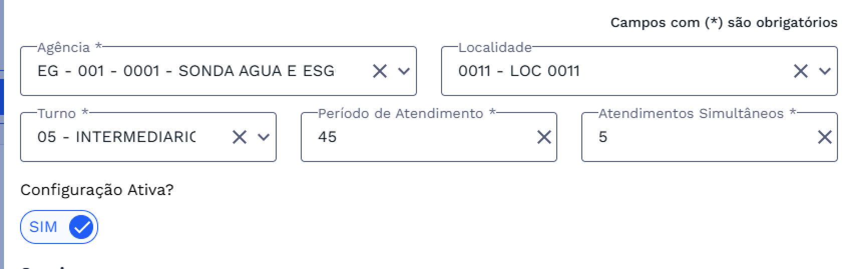 Durante a configuração, é necessário relacionar a agência, a localidade e o turno que será utilizado. O turno deve estar previamente cadastrado na aba de turnos para que possa ser selecionado. Também deve ser informado o período de atendimento, a quantidade de atendimentos simultâneos e definido se a configuração ficará ativa ou inativa.