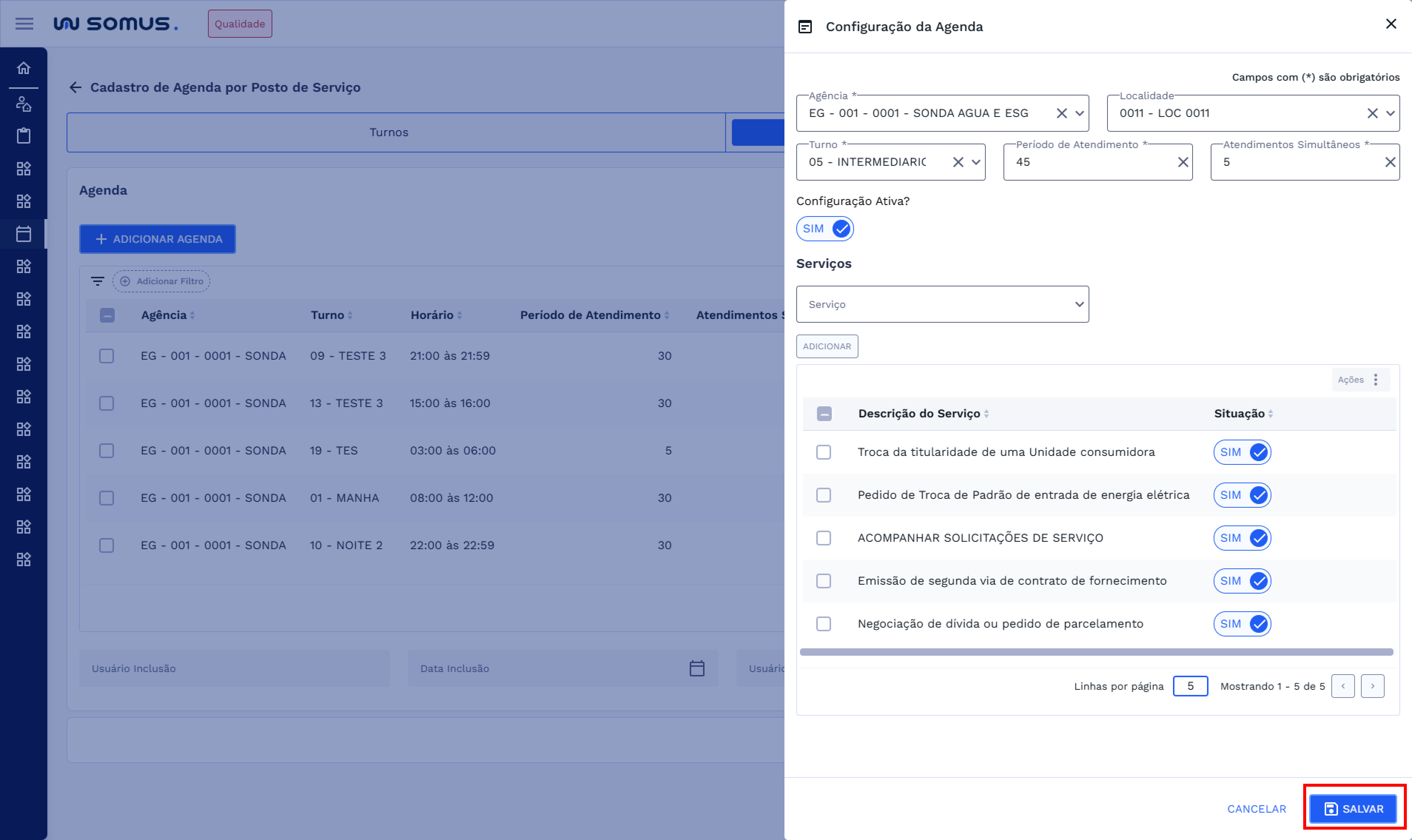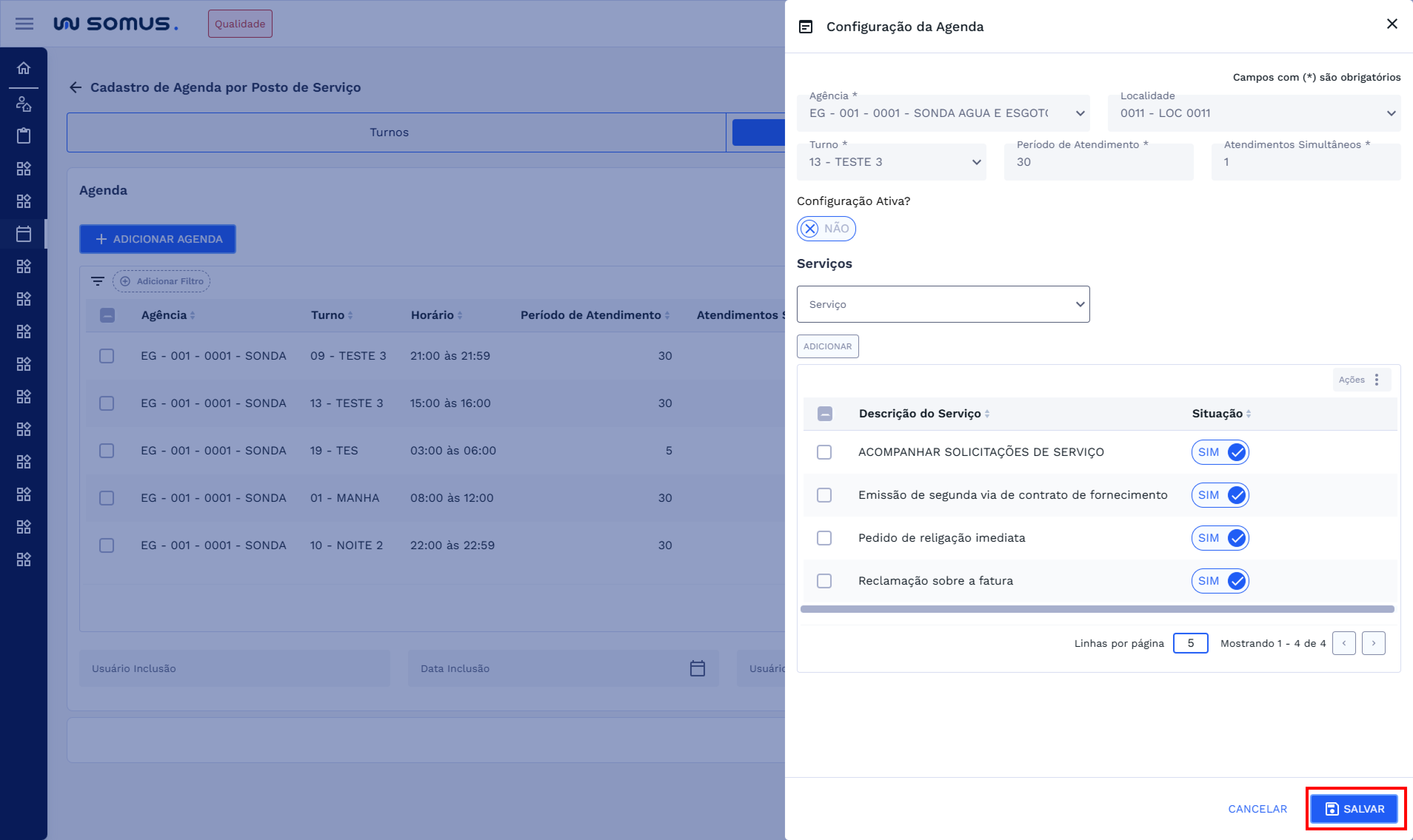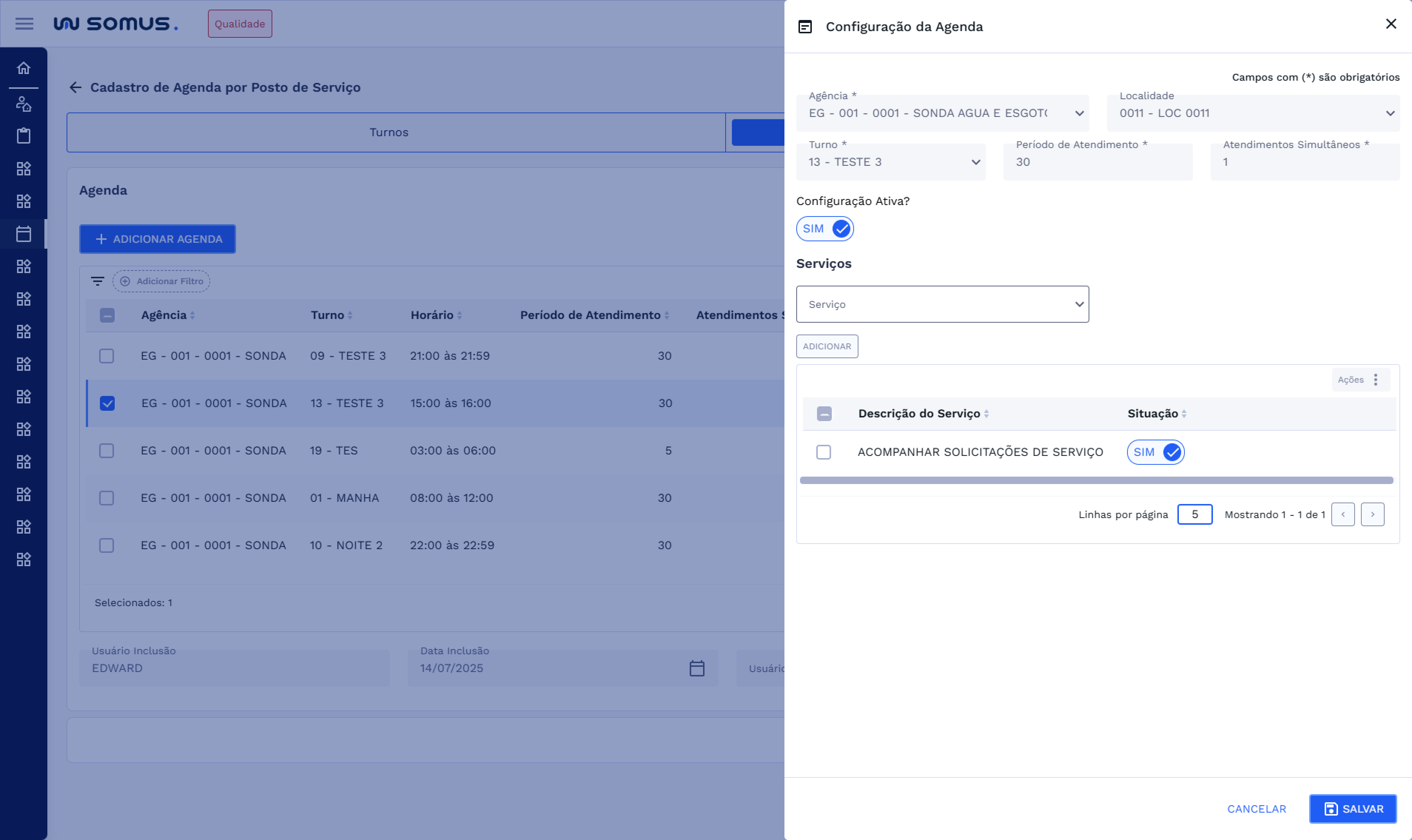 Durante a configuração, é necessário relacionar a agência, a localidade e o turno que será utilizado. O turno deve estar previamente cadastrado na aba de turnos para que possa ser selecionado. Também deve ser informado o período de atendimento, a quantidade de atendimentos simultâneos e definido se a configuração ficará ativa ou inativa.
