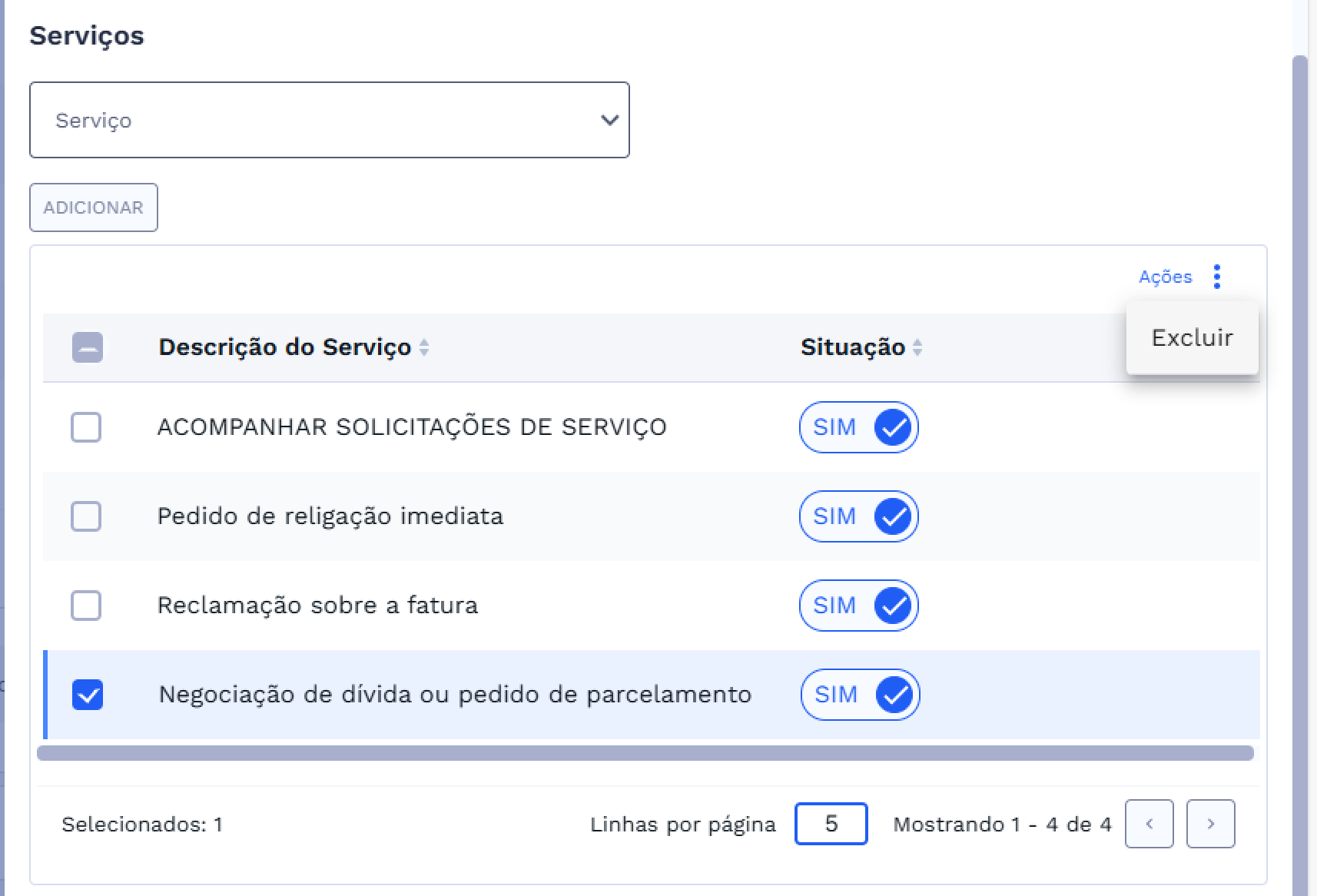 Caso seja necessário remover um serviço já inserido, selecione o item na tabela, clique no botão “Ações”, escolha “Excluir” e o serviço será removido da lista. O botão “Ações” só fica habilitado quando há um item selecionado.