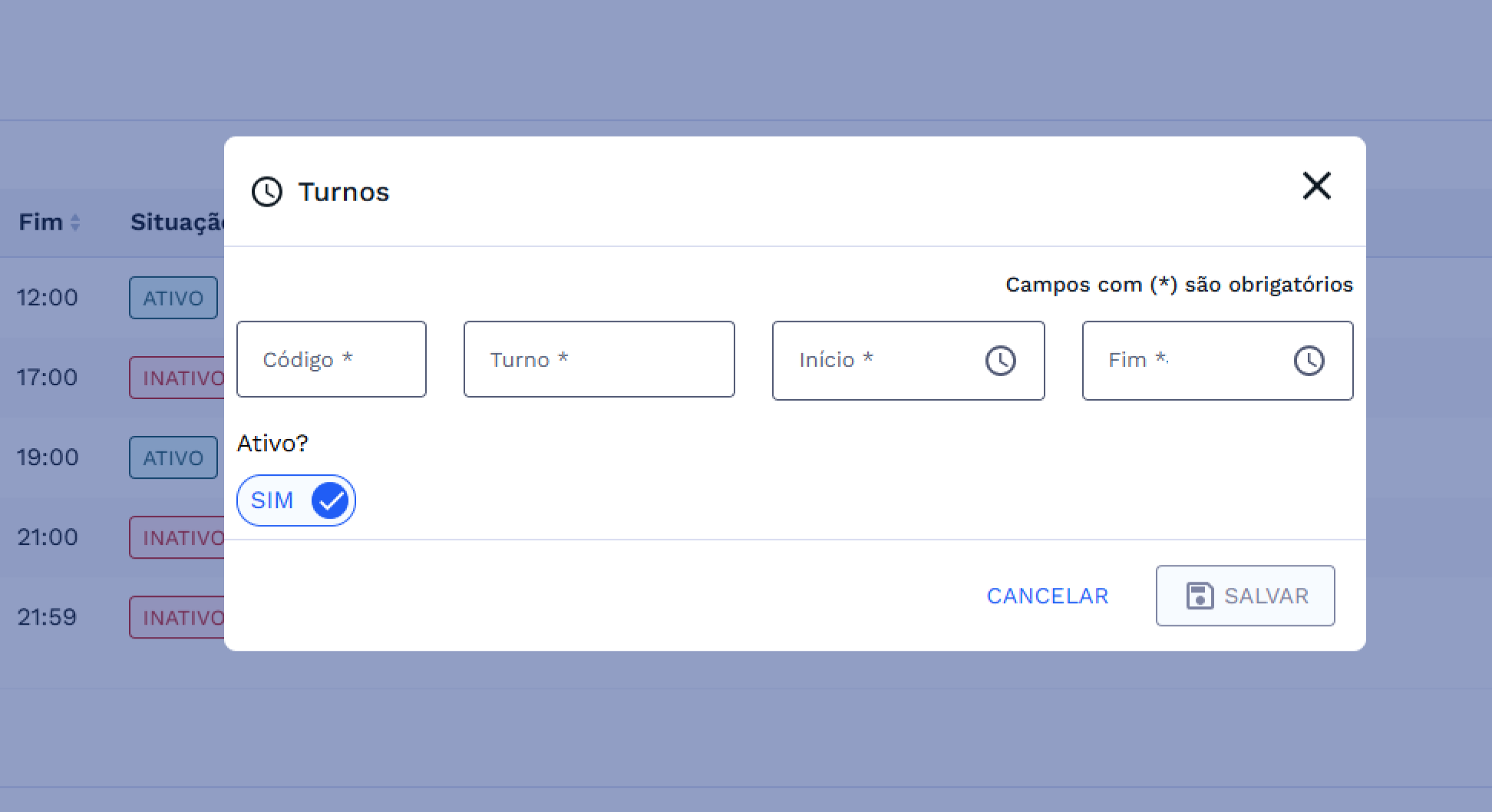 Ao clicar no botão “+ ADICIONAR TURNO”, uma janela modal será exibida com todos os campos em branco, pronta para o preenchimento.