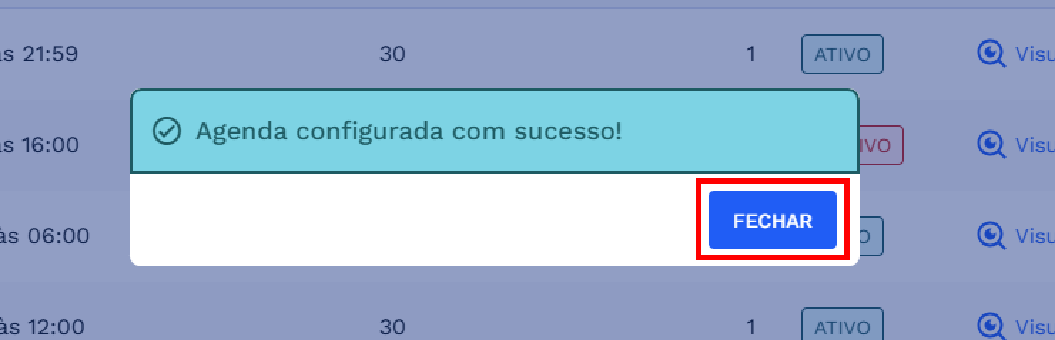 Se a configuração for realizada com sucesso, o sistema exibirá a mensagem “Agenda configurada com sucesso”.