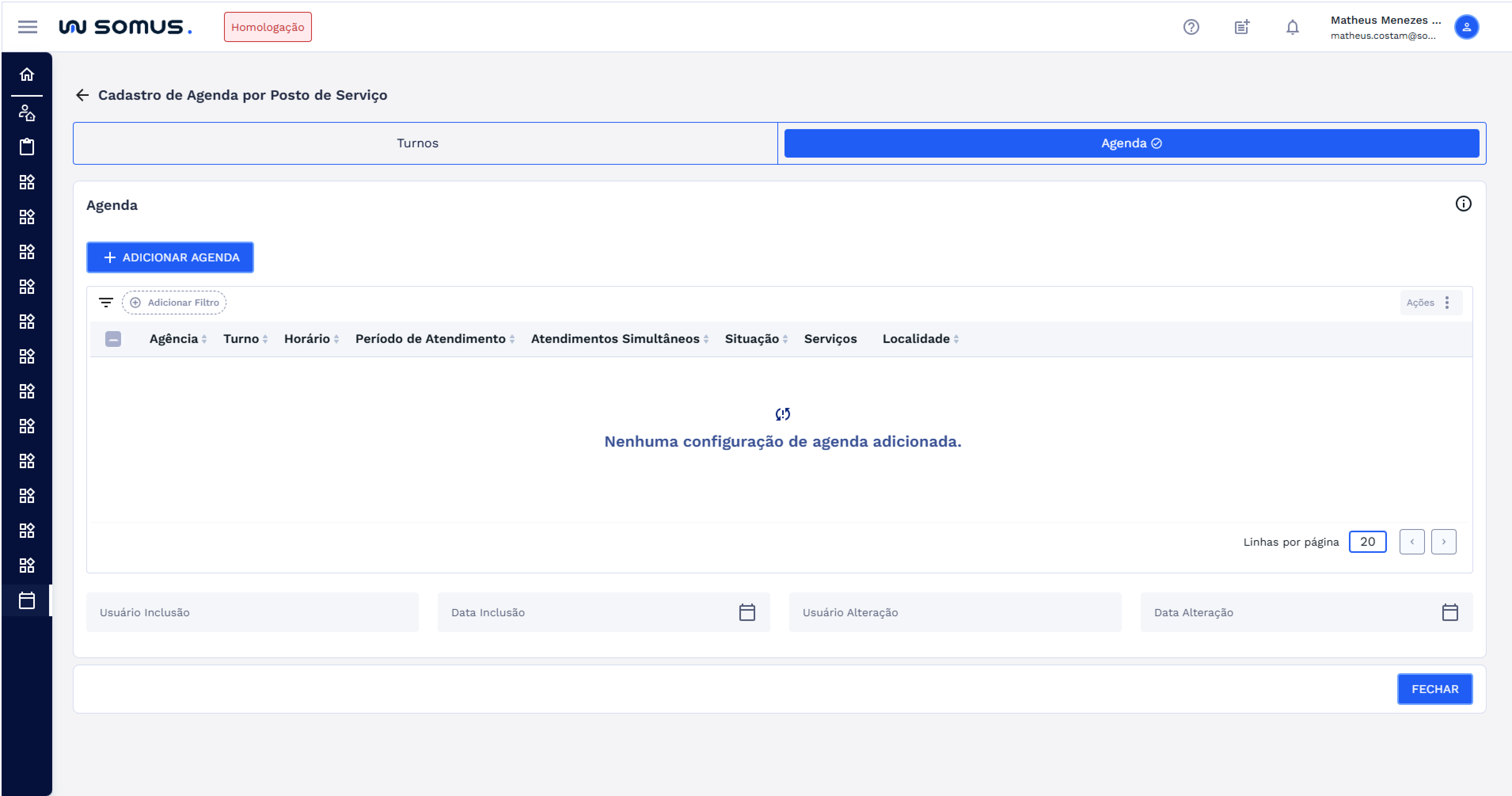 Na aba de agenda, o usuário pode consultar as agendas já configuradas para o posto, verificando detalhes como agência, turno, horários, período de atendimento, quantidade de atendimentos simultâneos, situação, serviços associados e localidade. A grade exibe ainda informações de auditoria, permitindo acompanhar o histórico de inclusão e alteração dos registros.