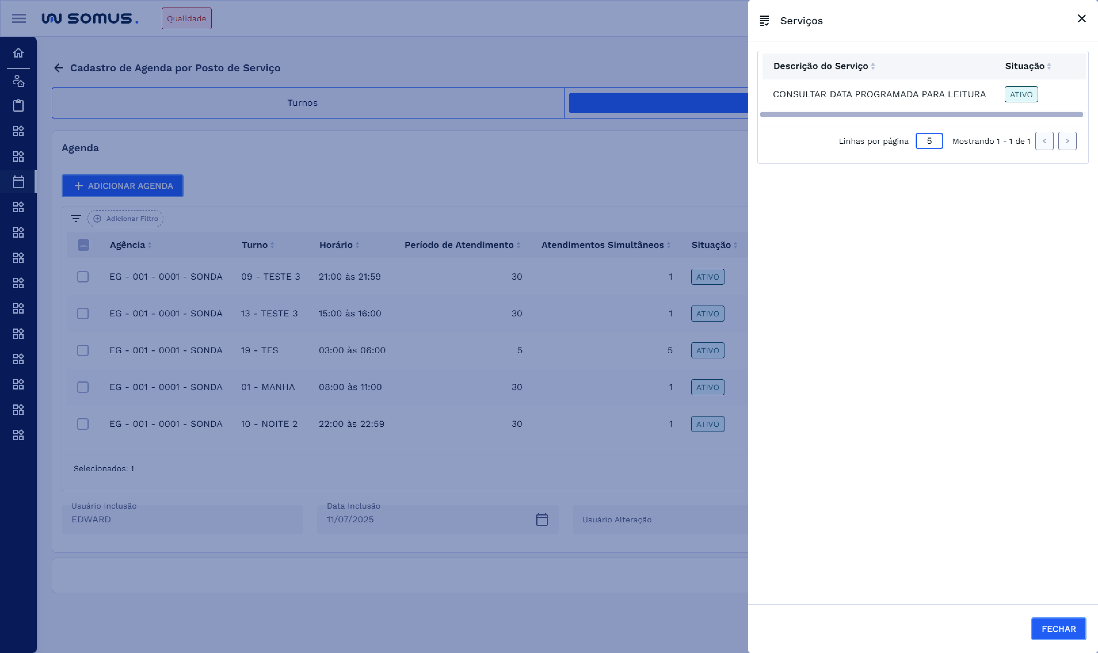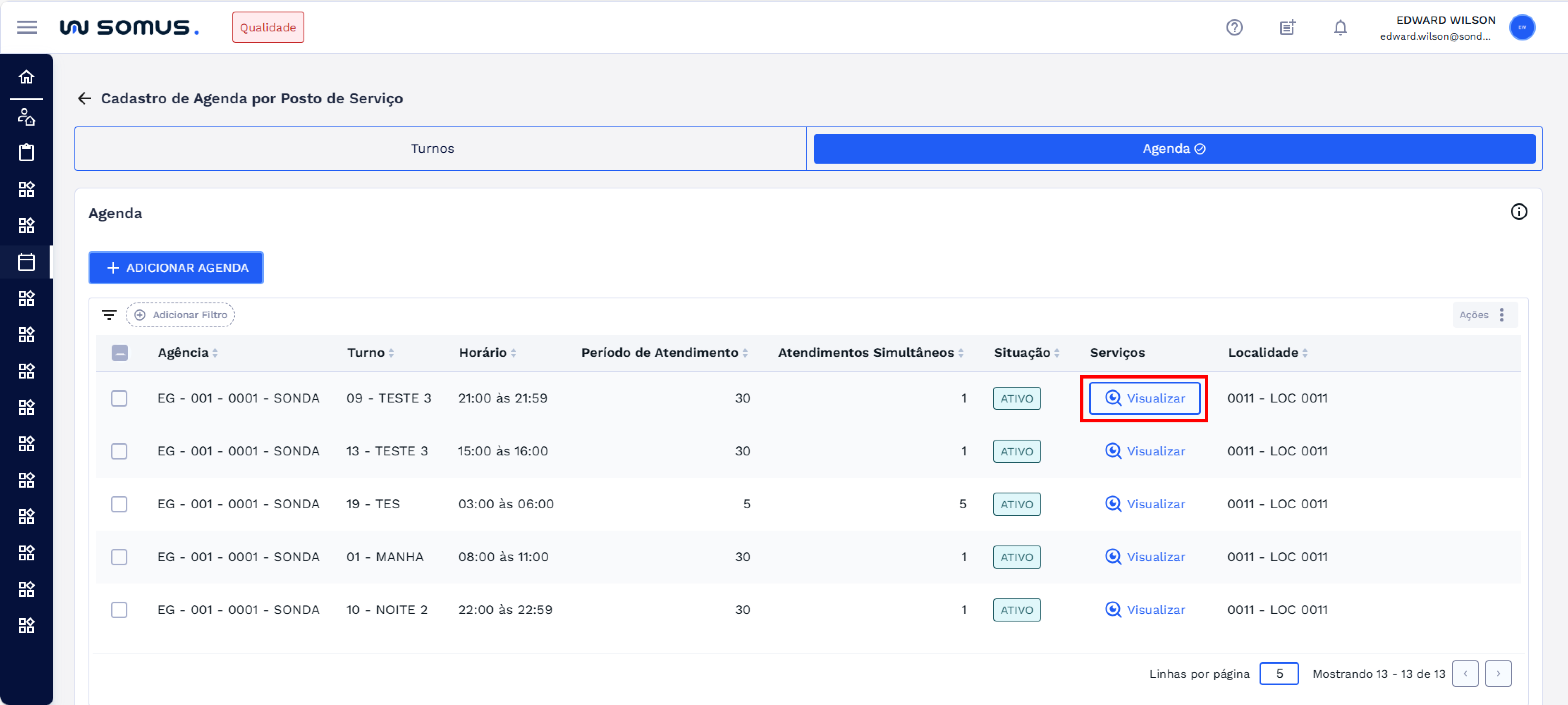 Ao executar esta ação, o sistema exibirá uma janela contendo a relação de serviços configurados para a agenda, apresentando a descrição e a situação de cada um.