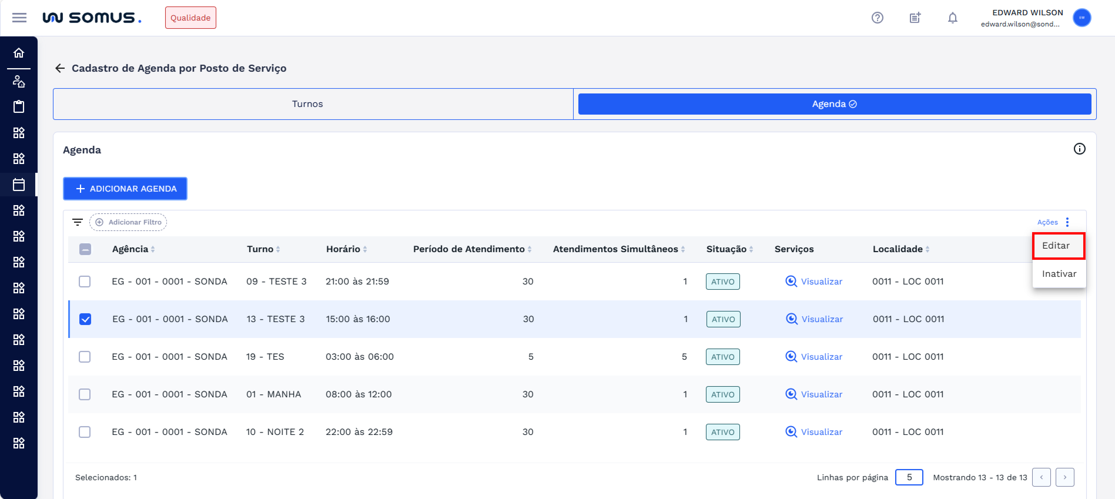 Para editar uma agenda, primeiro localize o registro desejado na lista. Em seguida, selecione a agenda desejada e clique no botão “Ações”.