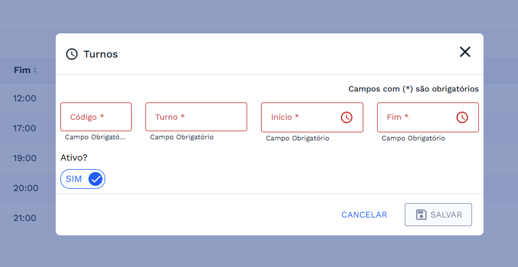 | Horário já cadastrado | Já existe um turno ativo configurado para o mesmo horário informado. | Ajuste o horário do turno ou inative o turno existente antes de prosseguir com o cadastro. |