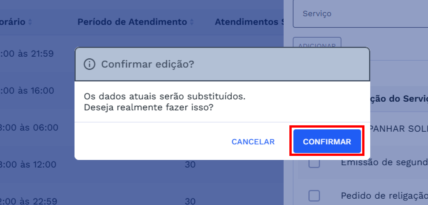 Após clicar em “SALVAR”, o sistema exibirá uma caixa de diálogo solicitando a confirmação da edição. Para concluir a atualização, clique em “CONFIRMAR”. Caso desista da alteração, clique em “CANCELAR” para interromper a ação e manter os dados anteriores. Confira o exemplo na imagem abaixo:
