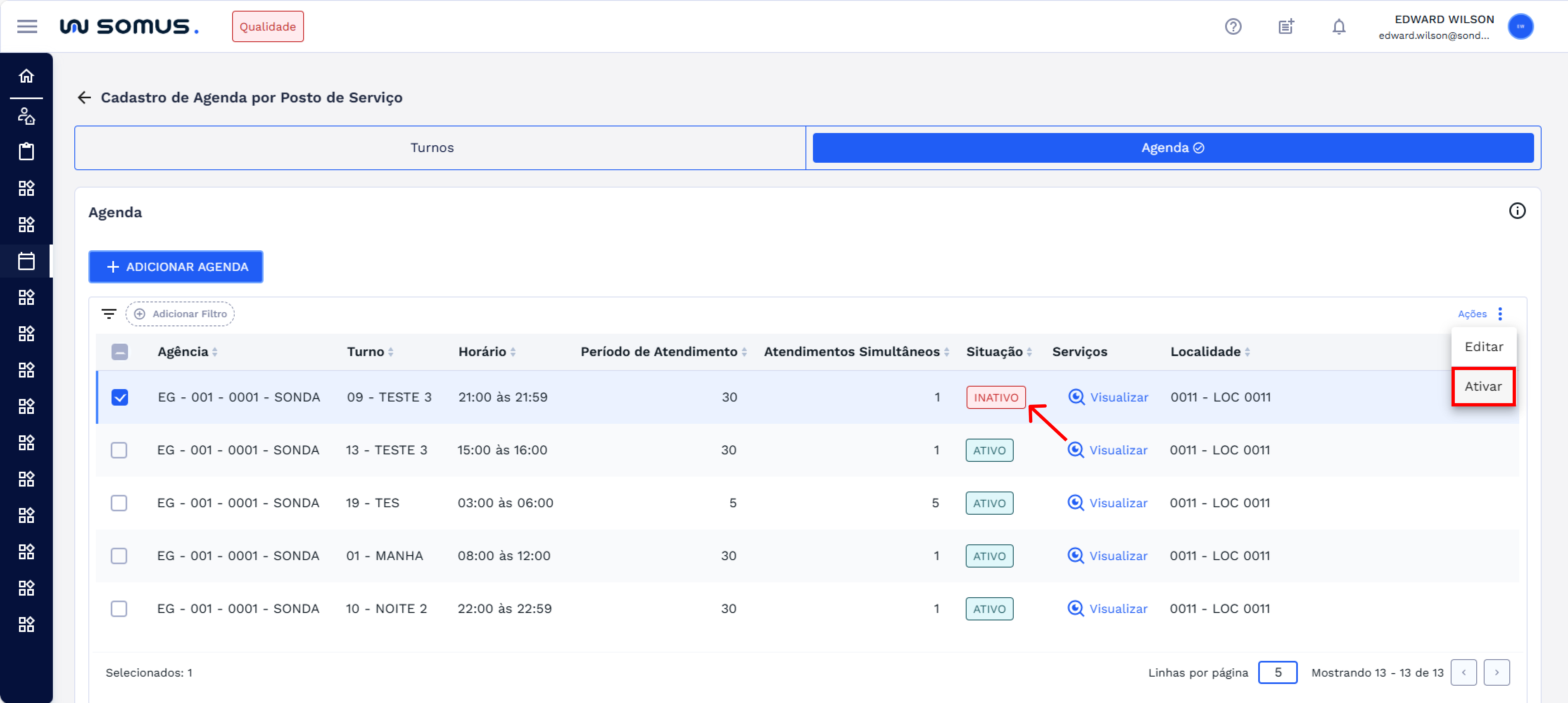 Para realizar a ativação, acesse a aba de agenda e selecione o registro desejado que esteja com a situação inativo. Em seguida, clique no botão “Ações”, que disponibilizará a opção “Ativar”.