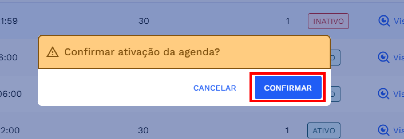Ao clicar em “Ativar” no menu “Ações”, o sistema exibirá uma caixa de diálogo solicitando a confirmação da ativação da agenda. Para confirmar e prosseguir com a ativação, clique em “CONFIRMAR”; caso deseje cancelar a operação, clique em “CANCELAR”. Veja o exemplo ilustrado na imagem abaixo: