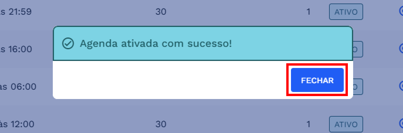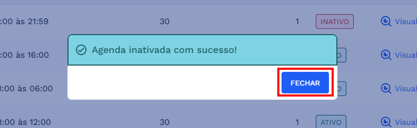 O botão “Fechar” estará disponível para encerrar o diálogo e retornar à lista de agenda.
