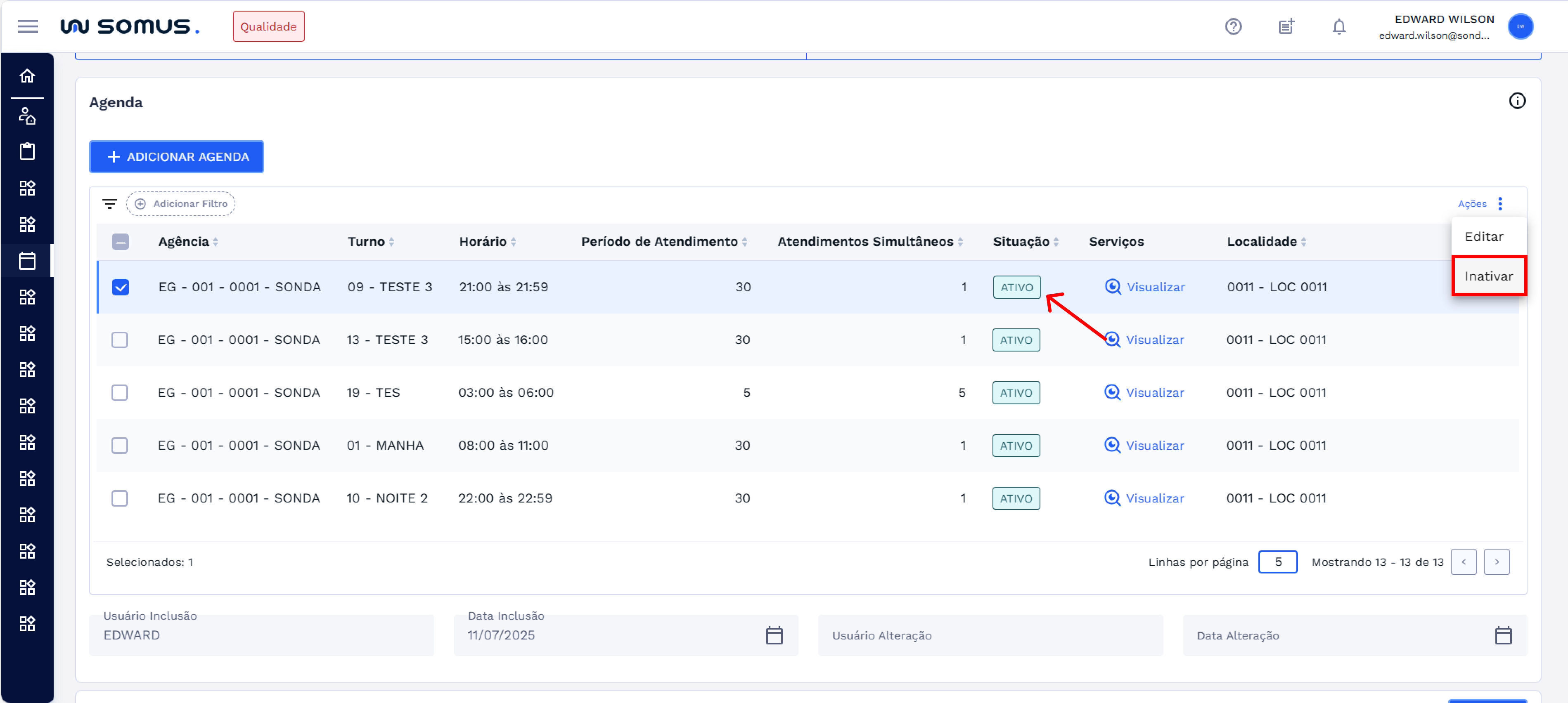 Para realizar a inativação, acesse a aba de agenda e selecione o registro desejado que esteja com a situação ativo. Em seguida, clique no botão “Ações”, que exibirá a opção “Inativar”.