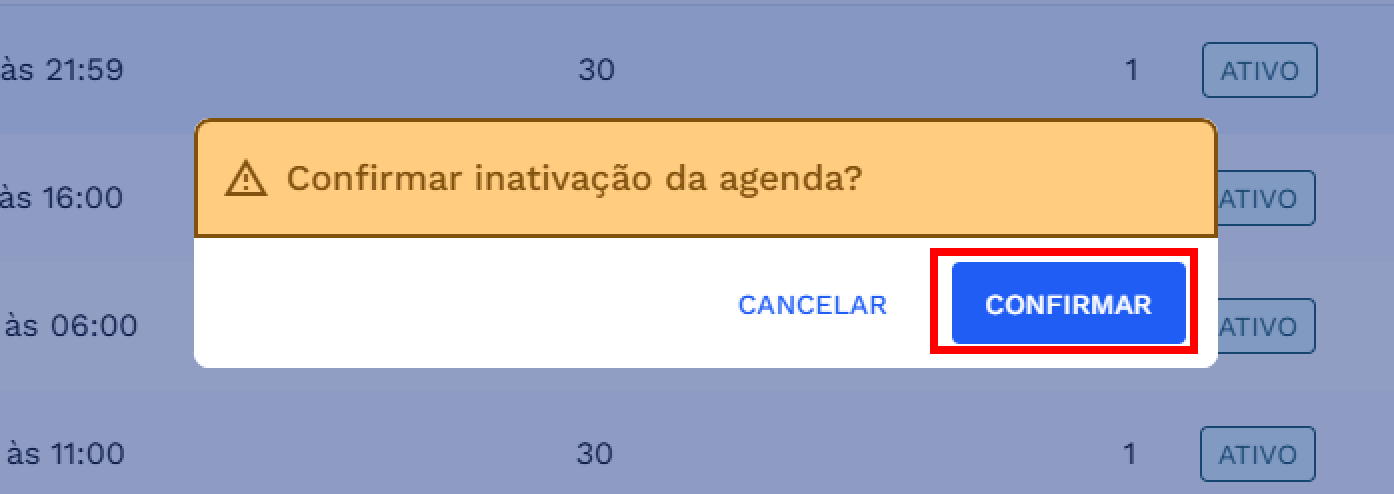 Ao clicar em “Inativar” no menu “Ações”, o sistema apresentará uma caixa de diálogo solicitando a confirmação da inativação da agenda. Para confirmar e concluir a inativação, clique em “CONFIRMAR”; caso deseje cancelar a operação, selecione “CANCELAR”. Confira o exemplo na imagem abaixo: