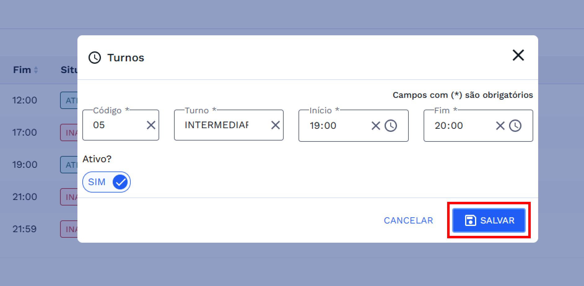 Para seguir com o cadastro do turno, preencha todos os campos obrigatórios. Os campos obrigatórios são indicados com um (*). Caso algum campo obrigatório não seja preenchido, o sistema exibirá uma mensagem informando qual campo precisa ser corrigido.