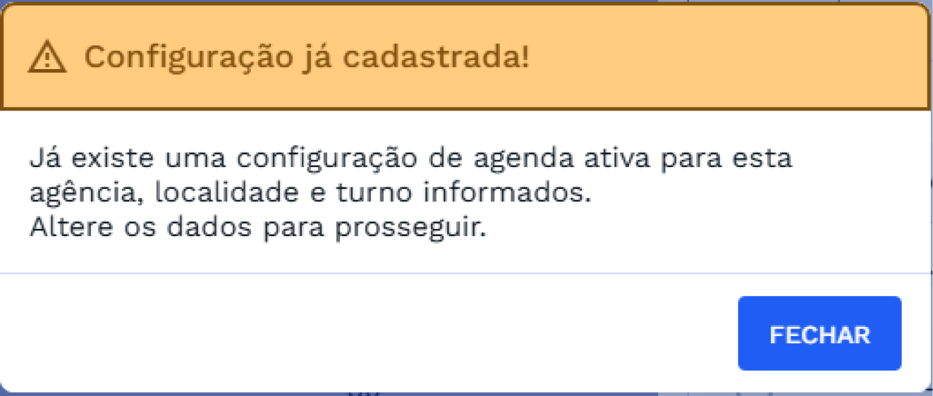 Caso o sistema identifique que já existe uma configuração ativa de agenda para a mesma agência, localidade e turno informados, será exibida a seguinte caixa de diálogo: