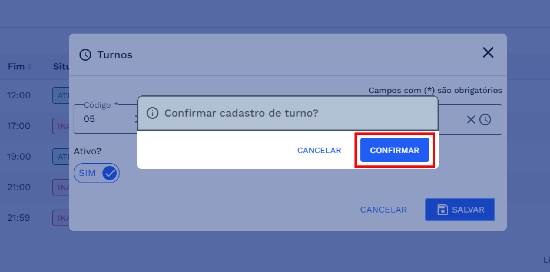 Clique em “SALVAR” e, na sequência, o sistema apresentará uma caixa de diálogo solicitando a confirmação do cadastro de turno. Para avançar, clique em “CONFIRMAR” e, caso deseje retornar, clique em “CANCELAR”, conforme mostrado na imagem abaixo:
