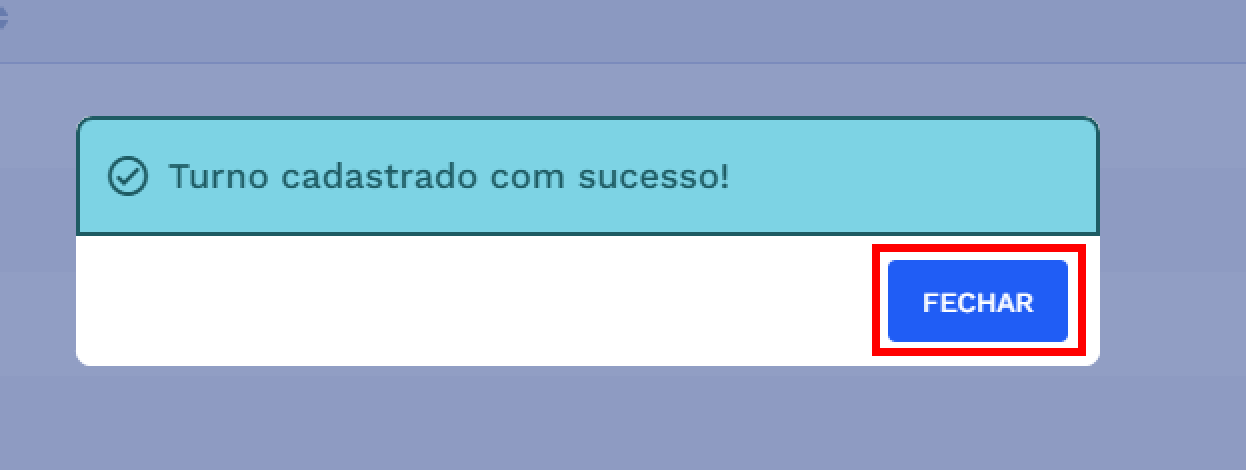 Se o cadastro for realizado com sucesso, o sistema exibirá a mensagem “Turno cadastrado com sucesso”.